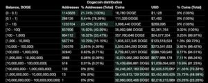 Данные BitInfoCharts на 1 ноября показывают, что эти 3,83 миллиона адресов владеют 141,68 миллиарда Dogecoin, которые оцениваются в $9,5 млрд.